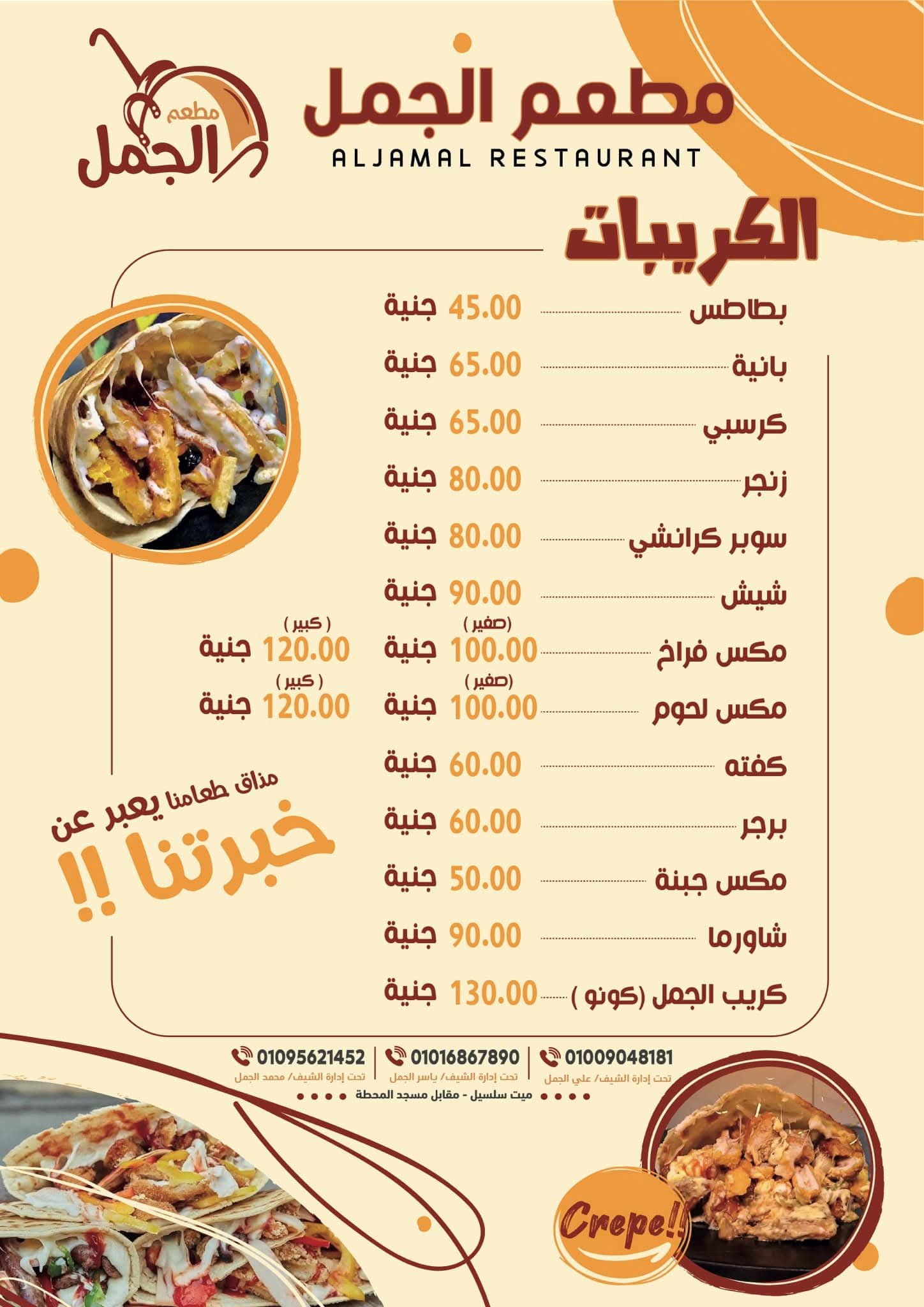 إذا كنت تبحث عن أفضل محلات وانشطة تجارية في ميت سلسيل أو ترغب في معرفة أسعار المنتجات في مطعم الجمل، فقد وفرنا لك هنا كل التفاصيل من أرقام تواصل، موقع على الخريطة، ومواعيد العمل الرسمية.